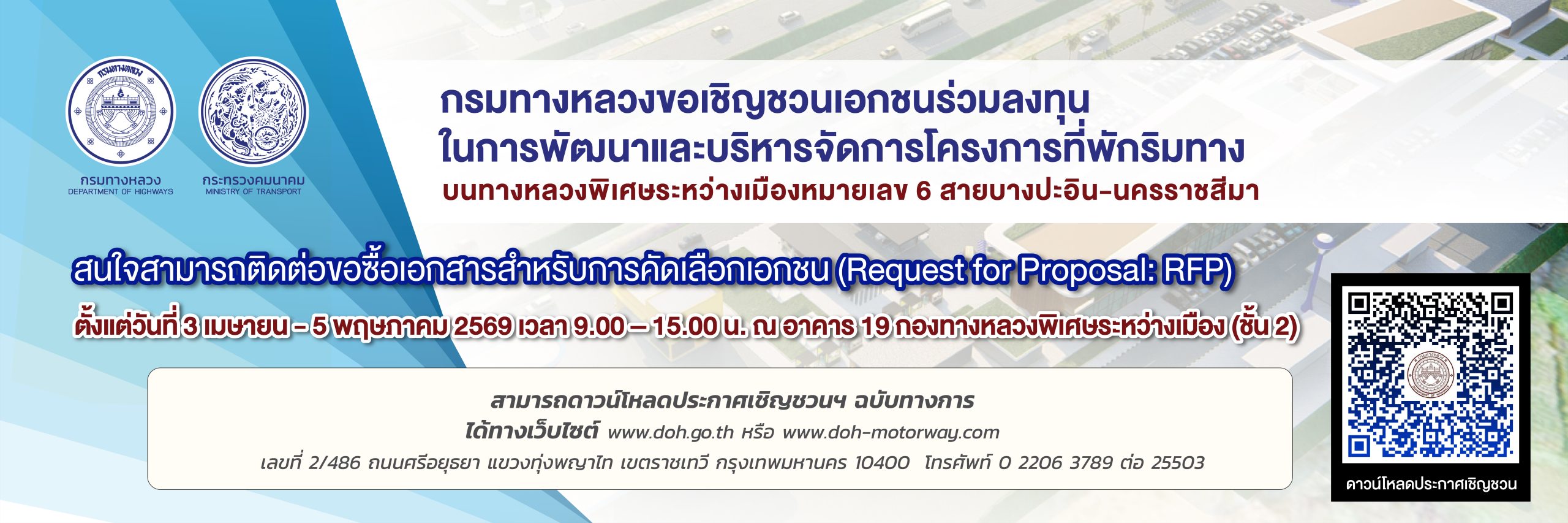 กรมทางหลวงขอเชิญชวนเอกชนร่วมลงทุน ในการพัฒนาและบริหารจัดการโครงการที่พักริมทาง บนทางหลวงพิเศษระหว่างเมืองหมายเลข 6 สายบางปะอิน-นครราชสีมา ผู้ที่สนใจสามารถติดต่อขอซื้อเอกสารสำหรับการคัดเลือกเอกชน (Request for Proposal : RFP) ตั้งแต่วันที่ 3 เมษายน – 5 พฤษภาคม 2569 เวลา...