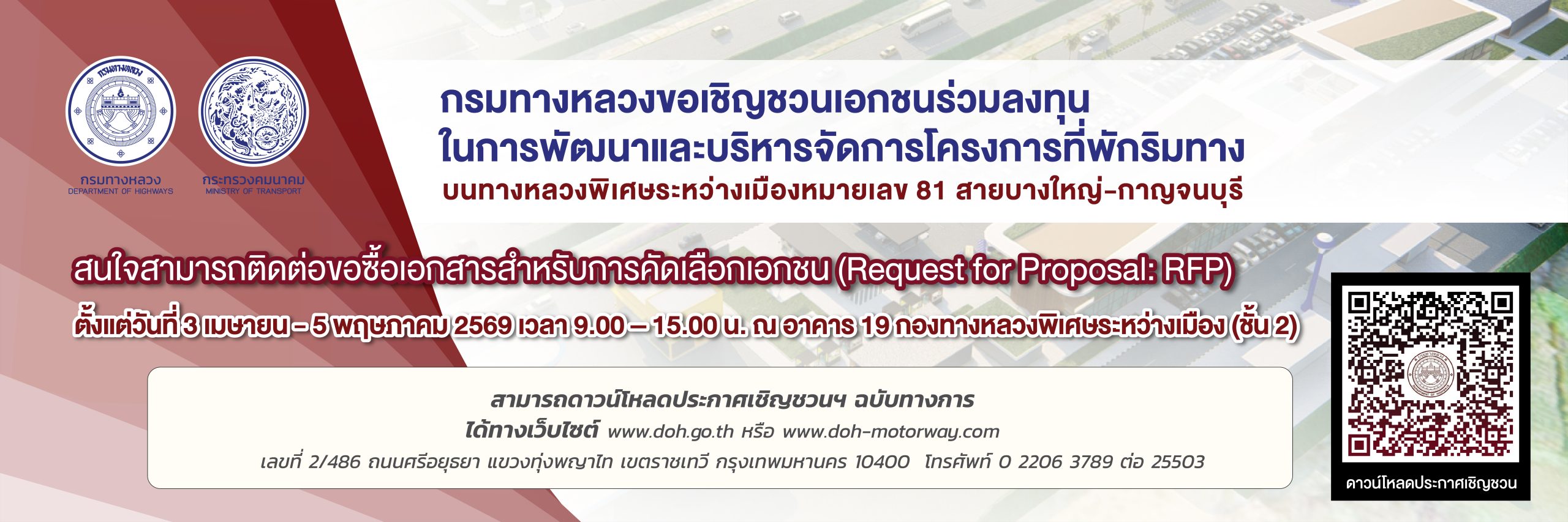 กรมทางหลวงขอเชิญชวนเอกชนร่วมลงทุนในการพัฒนาและบริหารจัดการโครงการที่พักริมทาง (Rest Area) บนทางหลวงพิเศษหมายเลข 81 สายบางใหญ่-กาญจนบุรี สนใจสามารถติดต่อขอซื้อเอกสารสําหรับการคัดเลือกเอกชน (Request for Proposalk RFP) ตั้งแต่วันที่ 3 เมษายน – 5 พฤษภาคม 2569 เวลา 9.00 –...